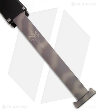This Microtech HALO V 3X has a hand ground tanto blade, stonewashed and almost 14 inches long. The handle is black anodized aluminum with the Marfione Dagger up front. The blade is retracted using the heat anodized titanium draw bar.