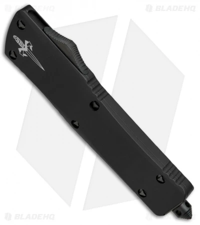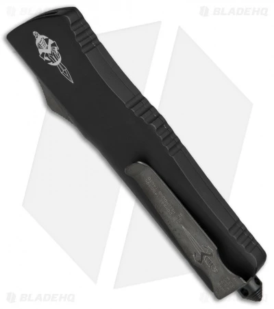 This Marfione Custom Combat Troodon automatic knife features a Hellhound Tanto blade made from M390 steel with a stonewash DLC finish. It has a black anodized 6061-T6 aluminum handle with an all black glass breaker, thumb slide, pocket clip, and hardware. The model, date, and Marfione Dagger are found on the pocket clip. Includes a certificate of authenticity.