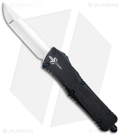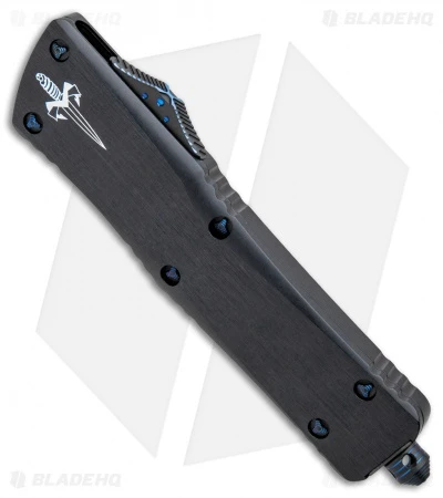 This Marfione Custom Combat Troodon automatic knife features a mirror polished M390 steel blade with an HP Star Grind. It has a black anodized alloy handle with blue ringed titanium hardware. The model, date, and Marfione Dagger are found on the pocket clip. Includes a certificate of authenticity.