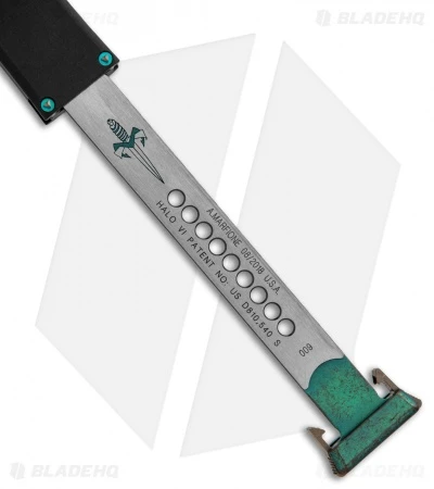 This The Halo VI has a Hellhound tanto blade with satin flats and bronze stonewashed grinds. Its handle is made from Mil-Spec anodized aluminum with antique green and bronze accents. The charging handle comes marked with the Marfione Dagger and date of creation.