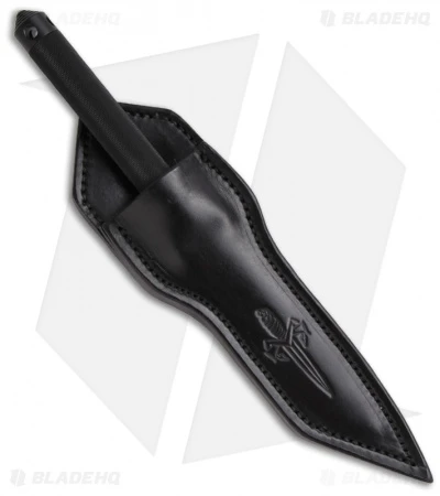 This custom A.D.O. (Alpha Detachment Operative) from Microtech is hand-crafted from a solid billet of 154CM steel. The tanto point blade is hand ground by Anthony Marfione; black ceramic coated with Dagger logo. This knife follows the design of Chris Reeve fixed blades with a hollow handle, accessed by unscrewing the glass breaker tip. This A.D.O. has knurled grip and comes with a custom leather sheath with embossed Marfione Dagger Logo.