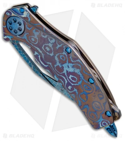 Marfione Custom Knives presents this impressive Mini Matrix flipper with a B. Reitveld Nebula Damascus blade and a stunning MokuTi handle. It features a MokuTi backspacer, Nebula Damascus lock tab, bronze anodized pocket clip, and blue anodized hardware to form an overall exquisite piece. The Marfione Dagger along with “A. MARFIONE MATRIX-R 11/2016” marked on the pocket clip.