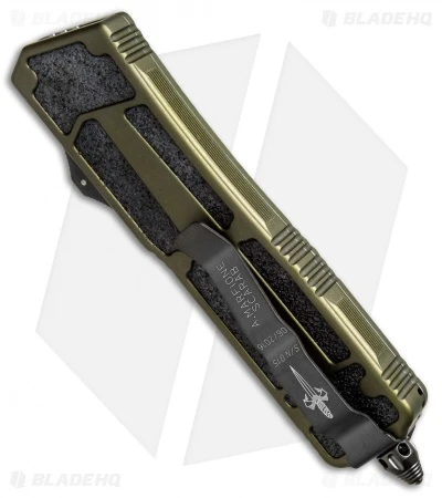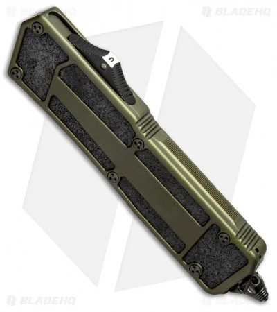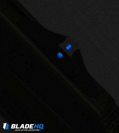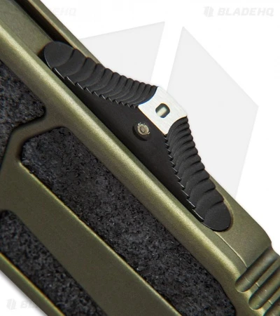 This Marfione Custom Scarab features a hand rubbed M390 steel double-edge blade with a two-tone, black DLC and satin finish. The OD green anodized body is outfitted with black hardware and a breaker tip. The pocket clip has the model information, including serial number, production date, and Marfione Dagger logo.