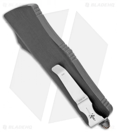 This Marfione Custom Troodon automatic knife features a clip point blade made from CTS-204P stainless steel with a hand satin finish. It has an aircraft alloy handle with a black finish and copper-ringed hardware and glass breaker. The pocket clip is satin-finished and engraved with the serial number, date of creation, and the Marfione Dagger. Includes a certificate of authenticity.