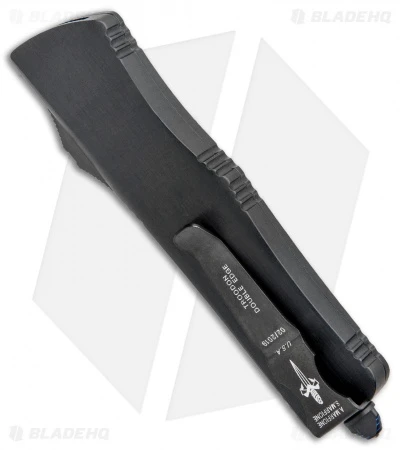 This Marfione Custom Troodon automatic knife features a dagger blade made from Bohler M390 stainless steel with a mirror polish. It has a hefted alloy handle with a black finish and blue anodized titanium hardware. The model, date, and Marfione Dagger are found on the pocket clip. Includes a certificate of authenticity.