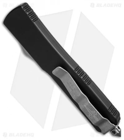 This model of the Ultratech features an apocalyptic finished double-edge dagger blade with hand, hollow grinds. The 6061-T6 aluminum chassis is black anodized and outfitted with an apocalyptic finished firing button slide and pocket clip. The Dagger logo is prominently displayed on the face of the handle and the pocket clip.
