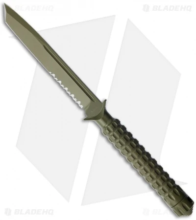 The A.D.O. (Alpha Detachment Operative) is an extraordinary fixed blade knife from Microtech. This ADO features a green finished tanto blade (partially serrated) with a partly sharpened swedge spine (less than 1/4″ at the tip). The handle with a waffle-style texture and features a Chris Reeve style hollow handle, accessed by unscrewing the glass breaker tip. It is made from a solid billet of stainless steel. The A.D.O. includes a composite sheath with a spring loaded tab to secure knife and a 2″ steel clip for belt carry.