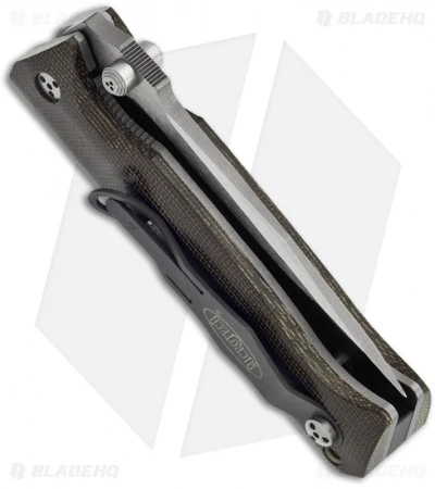 This Microtech CMTX5 is a dual action automatic; it opens with either the thumb stud or secret firing button (beneath pocket clip)! This knife features a satin finished S30-V steel blade (partially serrated) and green canvas Micarta handles. The pocket clip is tip-up carry and includes the original sheath.