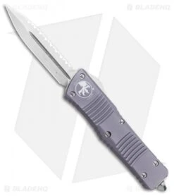 This Combat Troodon has an Elamx stainless steel double-edge dagger blade with a stonewash finish and one fully serrated edge. The handle is gray anodized aluminum with bead blast finished steel glass breaker, pocket clip and hardware.