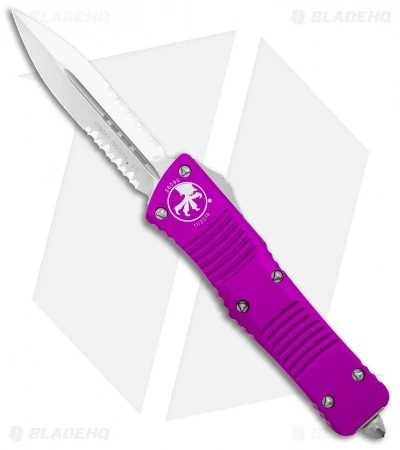 This Combat Troodon has a double edge dagger blade with a satin finish and partially serrated edges. The handle is violet anodized aluminum with bead blast finished steel glass breaker, pocket clip and hardware.