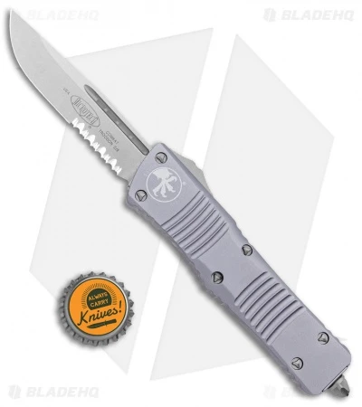 This Combat Troodon has a stonewash finished stainless steel blade with a partially serrated edge. Gray aluminum handle with bead blast finished steel glass breaker, pocket clip and hardware.