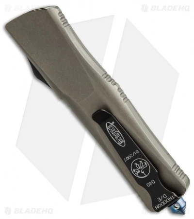 The Microtech Troodon knife is named after the Troodon dinosaur. This Troodon has a satin gray finished T6 aluminum handle with blue anodized hardware and glass breaker tip. The double edged blade is machine ground Damascus steel. The knife has a black anodized aluminum thumb slide and steel pocket clip.