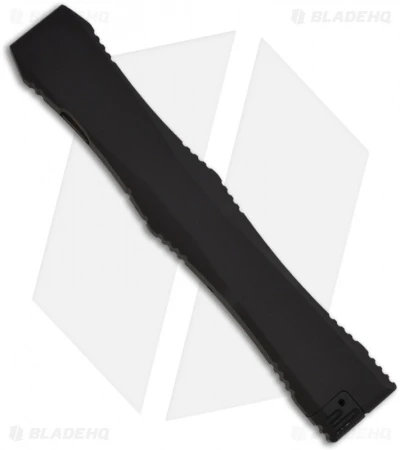 The Nemesis IV knives have black anodized aluminum handles that feature a milled contoured surface. They have also customized the hardware with the triangle screws and triangle “topographical” firing button.