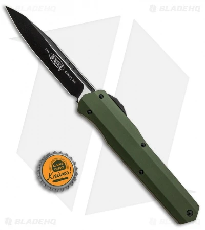 The Microtech Cypher OTF is a production version of the popular A. Marfione / D.C. Munroe custom collaboration. This model is equipped with a black plain edge blade. Its stylized handle is made from lightweight aluminum with an OD green anodized finish and a titanium milled pocket clip.