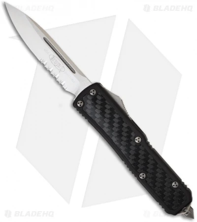 The Microtech Daytona is an impressive double action out-the-front automatic knife! This Daytona has a satin finished drop point blade made from premium S35-VN steel (partially serrated). The handle is black anodized aluminum with polished carbon fiber inserts on front and back. The sturdy pocket clip has the serial number and Microtech logo. Includes glass breaker.