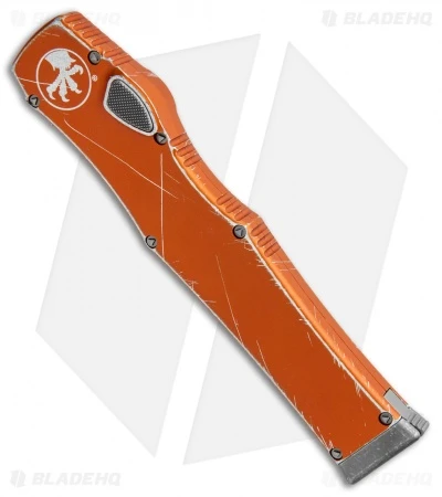This Halo VI is equipped with an Apocalyptic finished tanto blade. Its handle is made from distressed orange Mil-Spec anodized alloy. The charging handle comes marked with the Microtech logo and date of creation.