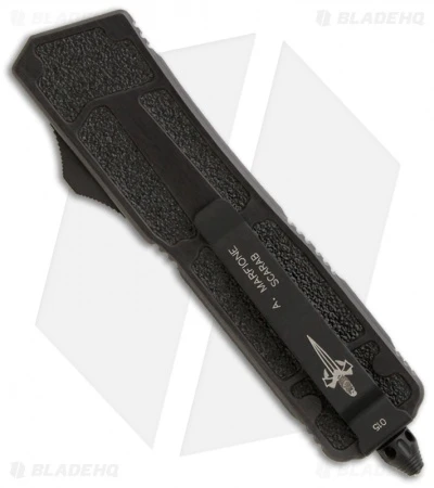 This Marfione Custom Scarab is a stunning knife! It features a carbon fiber laminated steel tanto blade with a chisel ground edge. The back side of the blade is bead blast finished and has scratches from being fired. Two-tone T6 aluminum handle has a black face and gray edges with drainage holes at the base. The hardware and glass breaker tip are black finished. The pocket clip is marked with the Marfione Dagger, “A. MARFIONE SCARAB” and serial number #015. This collectible knife comes in a Cordura case.