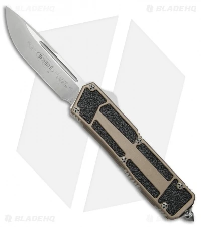 This Scarab has a drop point blade with a plain cutting edge and a satin finish. The tan anodized 6061-T6 aluminum handle has grip inserts on front and back. The hardware, pocket clip and glass breaker are bead blast finished. Model information and Microtech logo on the blade with the Scarab logo on the pocket clip.