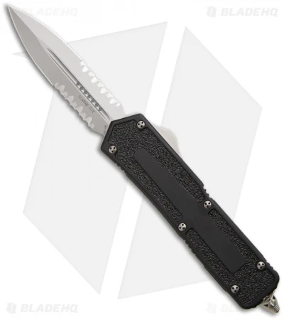 This Scarab has an S35VN stainless steel double-edged dagger blade with partially serrated edges and a bead blast finish. The black anodized T6 aluminum handle has grip inserts on front and back. The hardware, pocket clip and glass breaker are bead blast finished. Model information and Microtech/Scarab logos are on the pocket clip.
