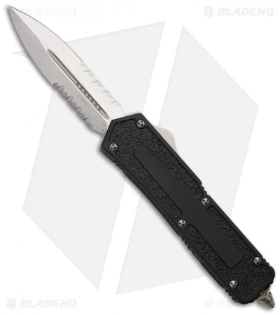 This Scarab has an S35VN stainless steel double-edged dagger blade with partially serrated edges and a stonewash finish. The black anodized T6 aluminum handle has grip inserts on front and back. The hardware, pocket clip and glass breaker are bead blast finished. Model information and Microtech/Scarab logos are on the pocket clip.