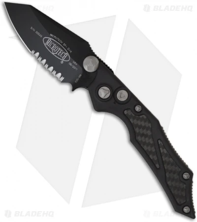 This is the Select Fire Double Action Knife. The blade opens manually with thumb studs or use the firing button for quick automatic action. Each knife comes with a Microtech “key” to turn this automatic into a manual only knife.