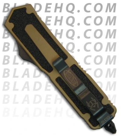 The Microtech Scarab is perhaps the mother of all out-the-front automatic knives. The Scarab is double action meaning it fires both out and in via the slide button located on the right side of the knife. Action, lock-up and quality are all Microtech-top-notch. This Scarab has a double edged two tone S30-V blade (one side is fully serrated and the other is plain) and tan anodized T-6 aluminum handle w/ grip-tech inserts. Pocket clip & glass breaker.