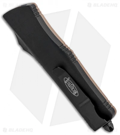 This model of the Microtech Troodon has a black finished, partially serrated blade and a tan G-10 top scale over a black aluminum chassis. It comes outfitted with black hardware.