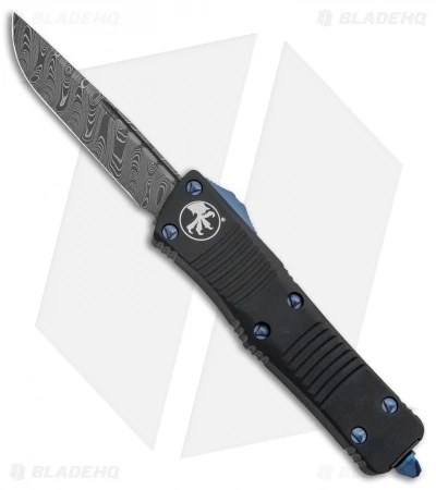 This model of the Microtech Troodon comes with a damascus blade and a black aluminum handle with blue ano titanium hardware.