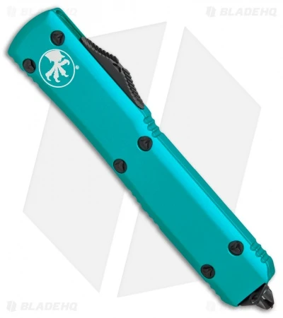 This Ultratech features a double-edged dagger blade with a black finish and plain cutting edges. It has a contoured, turquoise anodized 6061-T6 aluminum handle with a black finished pocket clip, glass breaker, and stainless steel hardware.