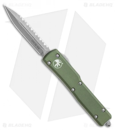 This UTX-70 features an OD green anodized aluminum handle. The double edged dagger blade is Apocalyptic-finished premium stainless steel with one side fully-serrated. The pocket clip and hardware are also Apocalyptic finished.
