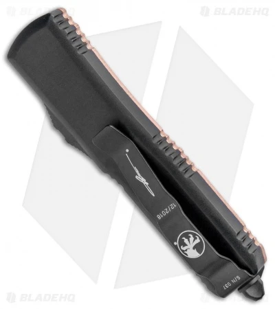 This UTX-85 has a black dagger blade and an aluminum handle with a copper front scale and black finished hardware, pocket clip, and glass breaker tip.
