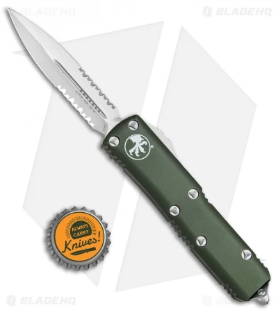 This UTX-85 model has a satin finished dagger blade with partially serrated edges. The 6061-T6 aluminum handle is OD green anodized and outfitted with bead blasted hardware, pocket clip, and glass breaker tip.