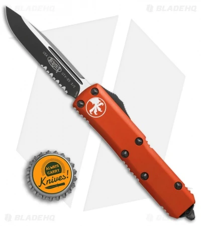 This UTX-85 model has a partially serrated, black finished Elmax steel blade. The 6061-T6 aluminum handle is orange anodized and outfitted with black finished hardware, pocket clip, and glass breaker tip.