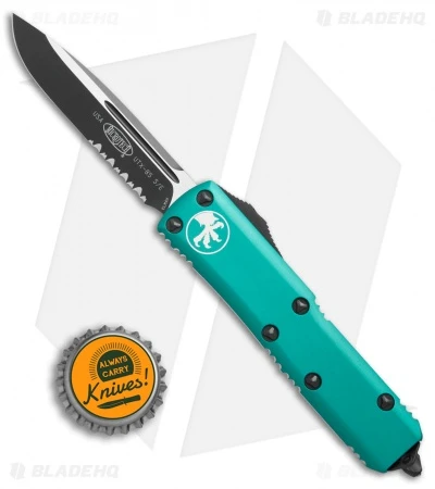 This UTX-85 model has a partially serrated, black finished Elmax steel blade. The 6061-T6 aluminum handle is turquoise anodized and outfitted with black finished hardware, pocket clip, and glass breaker tip.