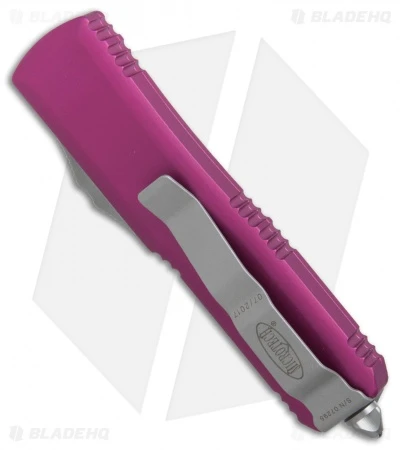 This UTX-85 model has a satin finished Bohler M390 stainless steel blade. The 6061-T6 aluminum handle is violet anodized and outfitted with bead blasted hardware, pocket clip, and glass breaker tip.